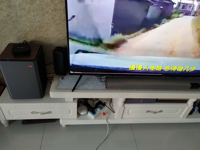重低音非常明显,两个小音箱放在沙发两侧,环绕声非常好,有在影院的感觉,样子时尚,放在客厅很搭