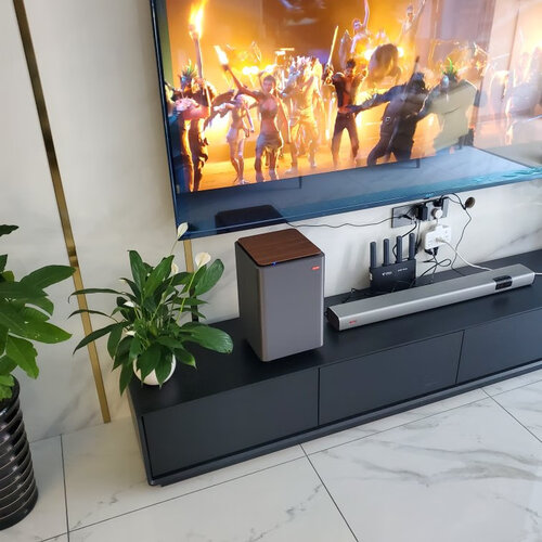 音响外观及效果都不错,家里放在客厅看个电影比原有电子声音提升很多。价格不高,安装非常便捷,无线链接值得点赞。