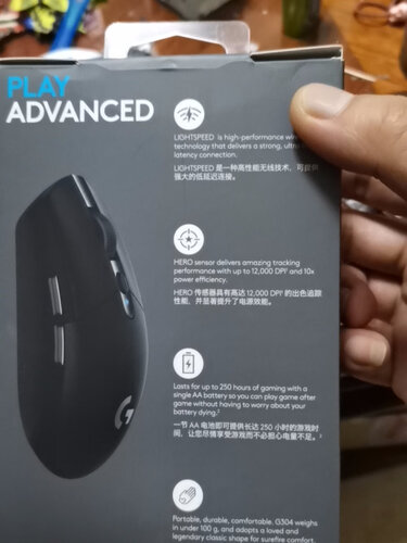 罗技G304 用户评价:舒适度:手握着蛮舒服的 外观颜值:还可以 便携度:换电池估计会重点了 响应速度:完全没延迟,玩cs感受不到 其他特色:中间滑轮手感不太好