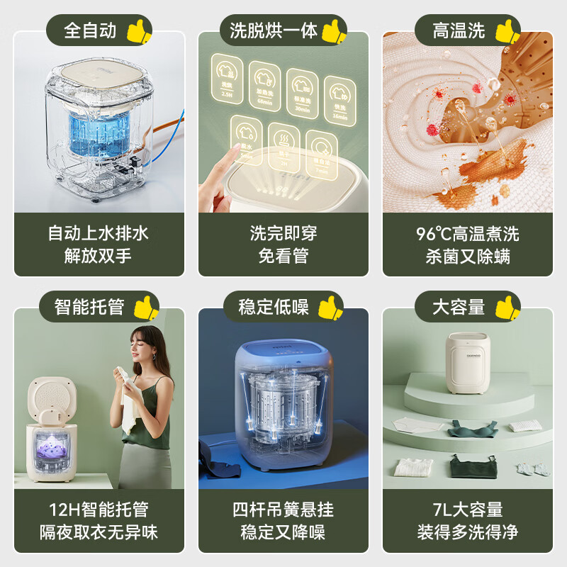 大宇洗衣机使用了一段时间才来评价,很不错,做工精致,材质厚实,没有什么异味,而且声音也不大,衣服洗完不会卷在一起,洗的也挺干净的。洗衣服洗的干净,声音除菌效果:好外形外观:颜色很喜欢洗净效果:洗完的衣服很柔软容量大小:好洗衣机的尺寸刚刚好,颜色跟我家也很配,特别是物流非常快,昨天下单第二天就送到。洗衣机洗衣声音不大,洗的很干净,非常满意的购物!外形外观:精致,美观,有光泽,大气洗净效果:好除菌效果:还没用过容量大小:合适以旧换新:顺畅