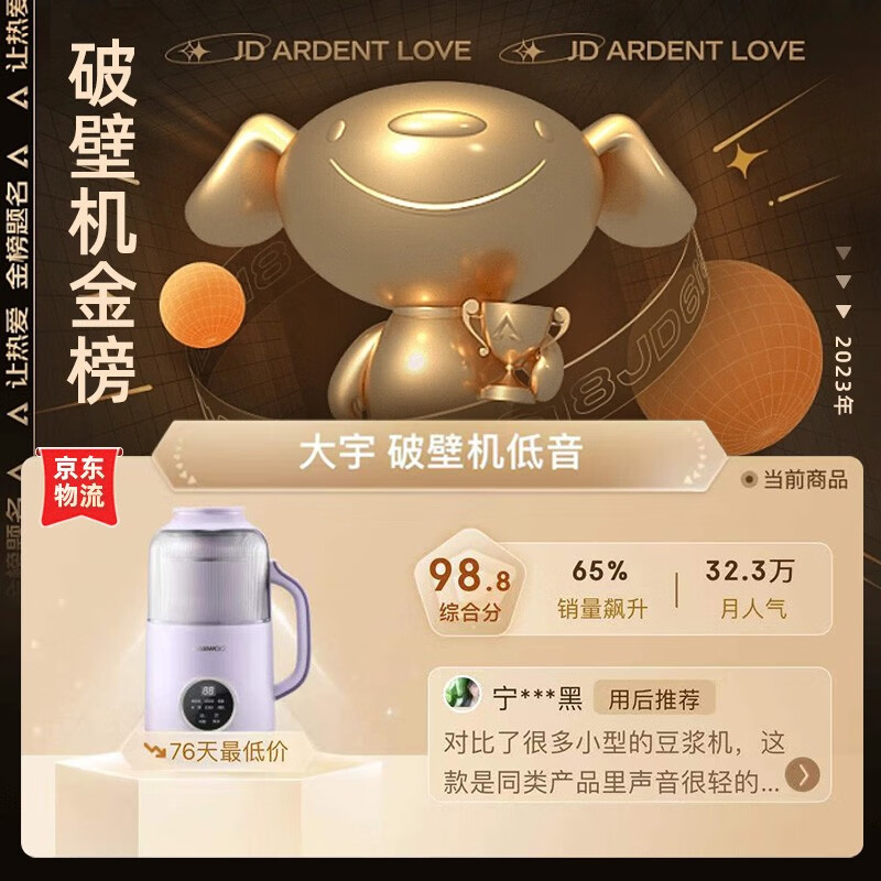 外观外形:颜值在线预约定时:很方便声音大小:很小打磨口感:很棒动力大小:强劲很大产品功能:很全棉总体很喜欢这款昨天收到货还没有用,外观颜色都很好看,容量也大,非常满意的一款,会推给朋友购买这款的。产品质量很好!外观小巧玲珑,使用方便。就是快递速度有点慢,不过京东客服都给解决了。总体还是不错的,都给五星好评吧!破壁机收到了,很好用,打出来的豆奶很细,这下自己在家就可以做出很多好渴的了。