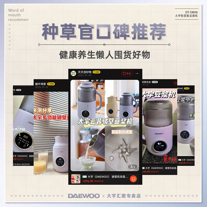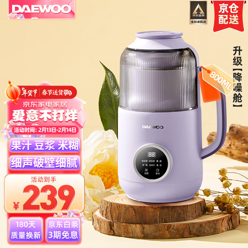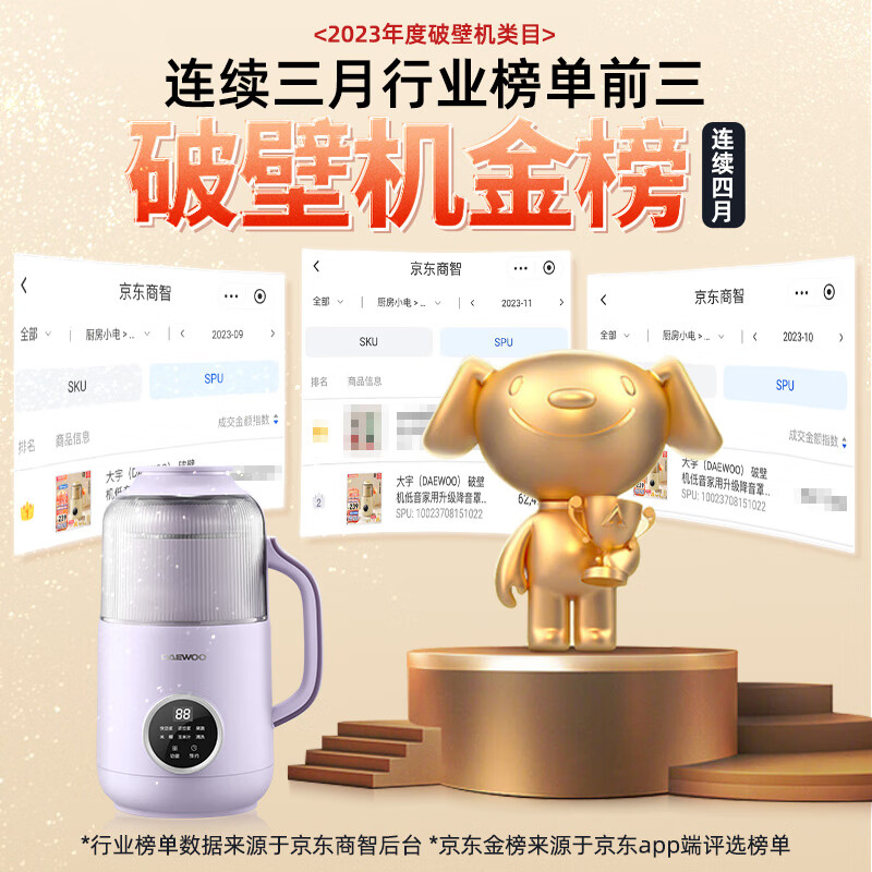 大宇破壁机豆浆机非常好用,打出来豆浆细腻,打果汁非常快,而且没有果渣,推荐给了身边好多人,朋友亲戚已经买了十几个了!豆浆机还可以。试了一下,打了个水果。很快的。客服还可以物流。也可以,也挺快的。会介绍朋友们买。破壁机不错,黑色大气很漂亮,可以预约定时,功能够用,物流也很快,回来试了下,满意,有需要还会再来一款很好用的破壁机,打出来特别细腻,声音也很小,外观也很漂亮