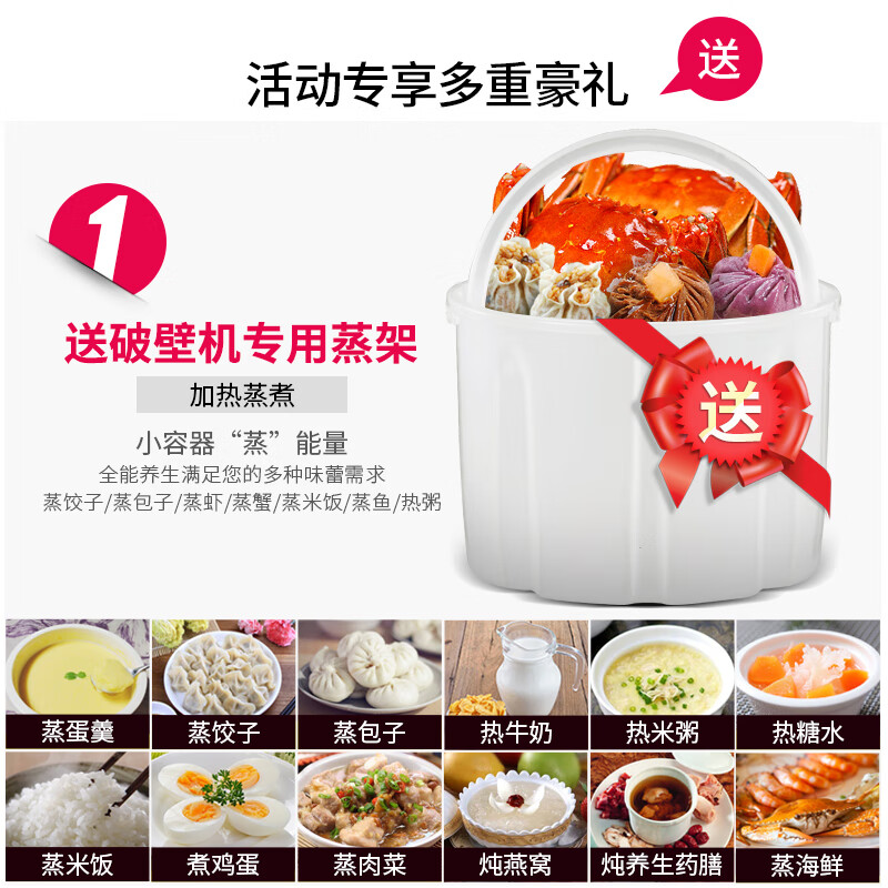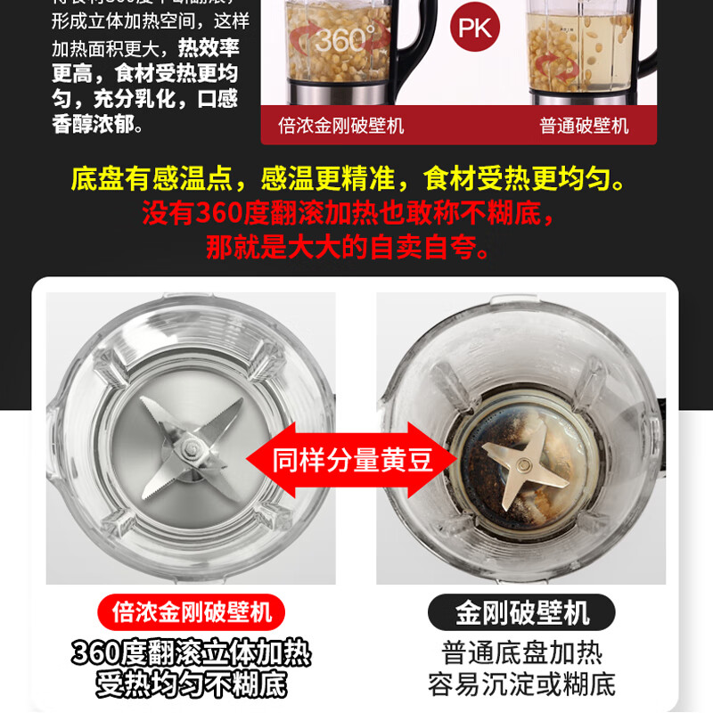 打过一次豆浆,感觉还可以,就是噪音有点大,味道还是不错的,挺喜欢,嘻嘻,希望好用,京东品质,还是信赖。货收到很满意,实物和图片一样,好用棒哒!朋友来我家给他推荐了一下她也要买。刚收到料理机,拆开看了,配件齐全。还有说明书及清洗工具,不怕不会用了。有空再试机看看功能,应该会和理想的一样吧。搞活动一百多,便宜好用,跟之前两百多的没什么区别,声音不大,细腻无渣打豆浆半小时很方便