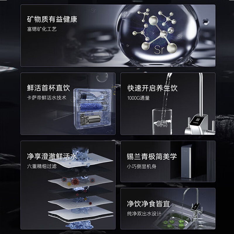 这款水机外观非常漂亮,不锈钢材质,出水水质达标,速度也可以,纯水和净水双出水,京东物流的速度依然那么快静音效果非常棒,处理速度也非常快,外观也非常大气,真的很赞。外包装无生产日期,师傅开箱后也无出厂合格证和生产日期,试用后声音刺耳大如雷,这样应非是产品,属假冒,须假一赔十。出水迅速,功能种类多,外观时尚大方,体验很不错,是一款好产品