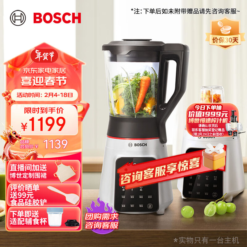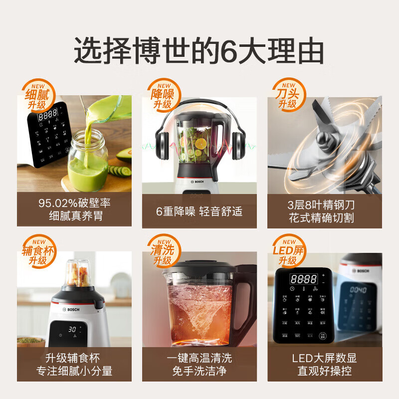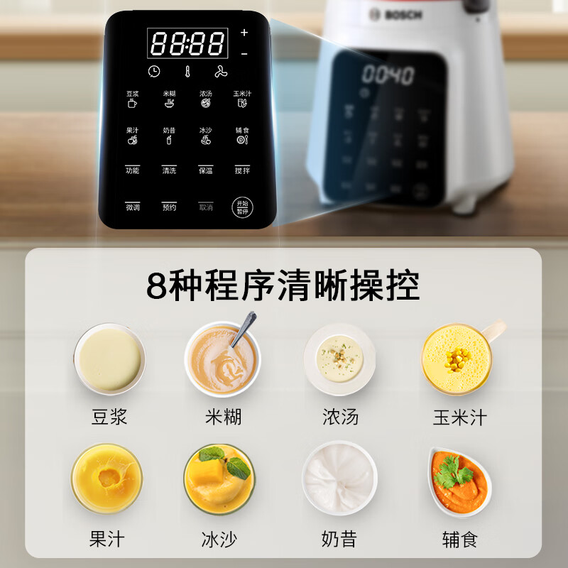 博世破壁机外观外形:给原图描述的非常符合,轻便好轻洗预约定时:非常方便,不用早上起来准备了,上班做早餐非常方便声音大小:能接受试了一下,打出来的豆浆挺细腻的,非常不错,很值得购买的一款产品挺不错的,买给老妈用的,不过自己先适用了几天,感觉比豆浆机细腻多了,很喜欢,准备再有活动时再买一台自己用很赞,豆浆很细腻,好喝,可预约,声音不是很大。给爸妈也弄一个。