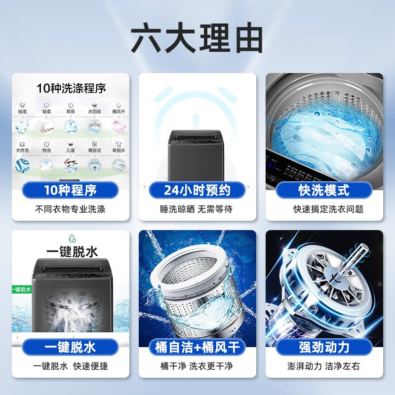 外形外观:家人都喜欢,超级棒。洗净效果:电机强劲有力,洗衣服被子刚刚好。除菌效果:杀菌消毒棒。容量大小:容量够大,全家衣服够洗。外形外观:今天收到的洗衣机外观还挺好看的,刚刚洗了衣服不错声音小而且洗得很干净,非常满意!外形外观:包装很好 颜色也很好看洗净效果:洗的很干净 有蓝光除菌 茼自洁功能除菌效果:特别好容量大小:容量很准 两人用足够了因为家里位置的原因 需要找深度比较小的洗衣机这款安装上很合适 很满意!安装师傅上门也很速度!