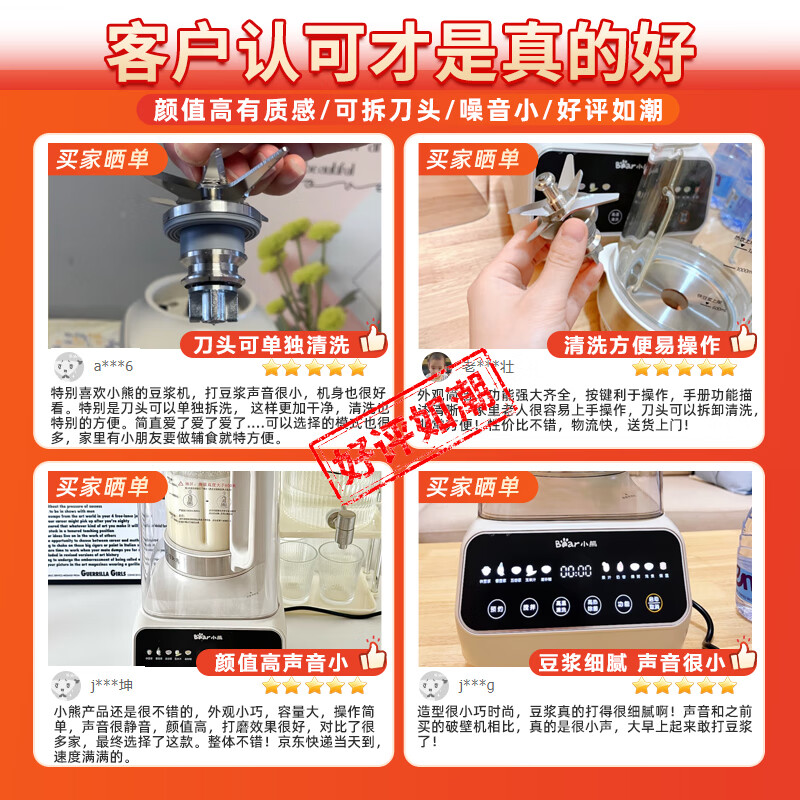 小熊破壁机买回来好长时间了,天天都在用,每天都换着花样做,做黑豆黑芝麻豆浆,做红豆米糊,用野果打的果汁,太喜欢破壁机了。买了两件,非常喜欢,声音不大,外观漂亮,父母家一件,自己家一件,以后可以随时喝上五谷豆浆了!杯体容量大,噪音低,能够快速的将食物粉碎,轻松的享受美味和营养,功能多样,满足不同消费者对食材美味需求!物流超级快!杯体厚实,拿在手上很有份量,家里的家电的居多,信任这个牌子,客服也挺有耐心的。