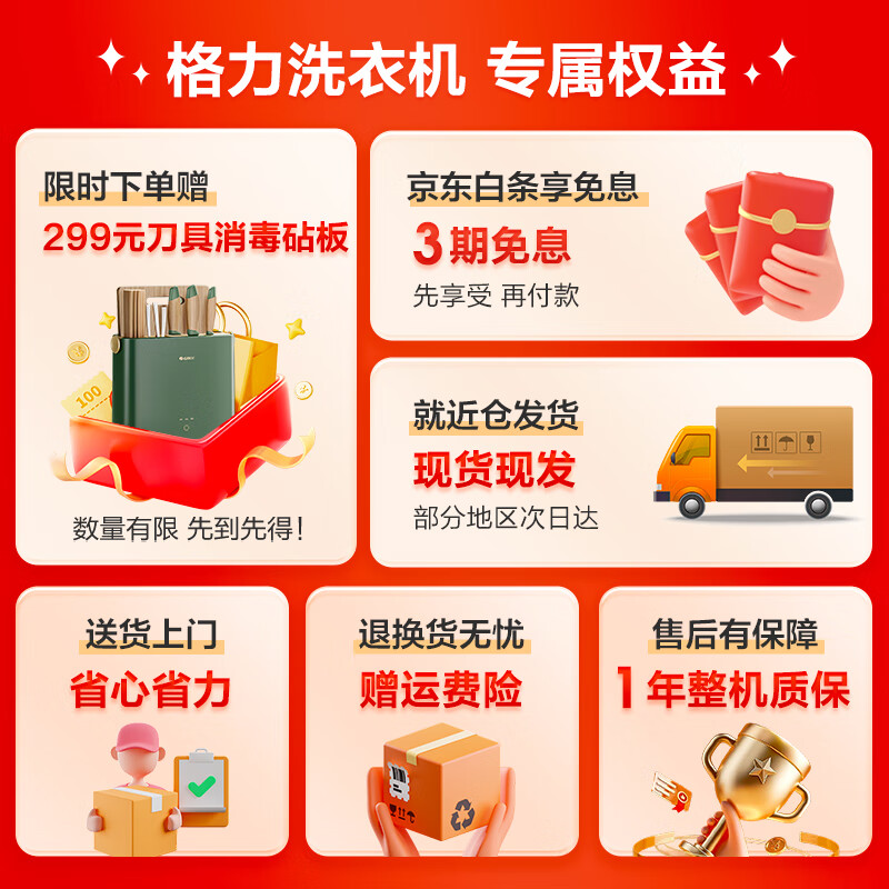 格力洗衣机洗衣机收到货了,颜值很高,是我喜欢的颜色,容量也特别大,波轮的这种比较省空间,而且洗衣机也没有噪音,好用家里也用的全部是的家电洗衣机到货很快,两个柜子光亮大气,按键简洁大方,电器十几年了一直用的品牌,希望能做的更好不锈钢内胆很好,花色很好看,很朴素,妈妈很喜欢,虽然中间出现了一些小插曲,但是也是成功解决了,客服态度很不错~外形外观:颜值相当漂亮,颜色和装修风格很搭洗净效果:衣服洗的蛮干净容量大小:一家三口蛮合适