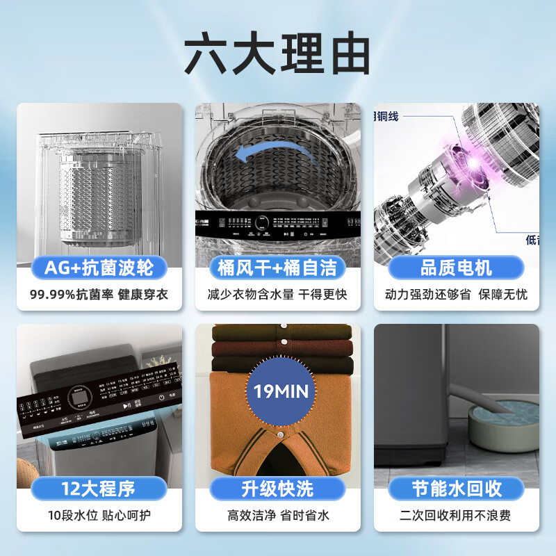 外形外观:非常漂亮,很惊喜,精致洗净效果:一直有用洗衣机,相信洗净效果容量大小:一家人也够用了除菌效果:可以可以可以试用了下,能洗干净烘干不用晾,烘干机声音真的很大,烘干时候要跑去二楼。送货师傅态度非常好洗衣机收到了,昨天晚上下单,今天下午收到,京东物流速度很快,洗衣机容量很大,一次可以洗很多衣服,声音很小,洗得干净,赞一个洗手机收到了,外观很好看,洗衣桶非常大,洗衣服还有蓝光杀菌,洗衣脱水声音小劲很大,值得推荐