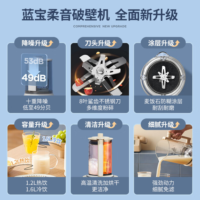 蓝宝破壁机破壁机非常实用,也很好用。打出的豆浆很细腻,打出的米糊也不错,打的时候声音不大。清洗功能也很实用。好评!一次满意的购物质量很好,没有任何质量问题,性价比很高,操作的也很方便.挺好用的,干黄豆不用泡也能打豆浆,豆浆磨的很细直接磨好煮好就能喝,良心商家还会回购的,会介绍给亲朋好友。选了好久,终于选择了这款豆浆机,颜值较高,主要声音小,打出来的豆浆细腻,感觉不错的!