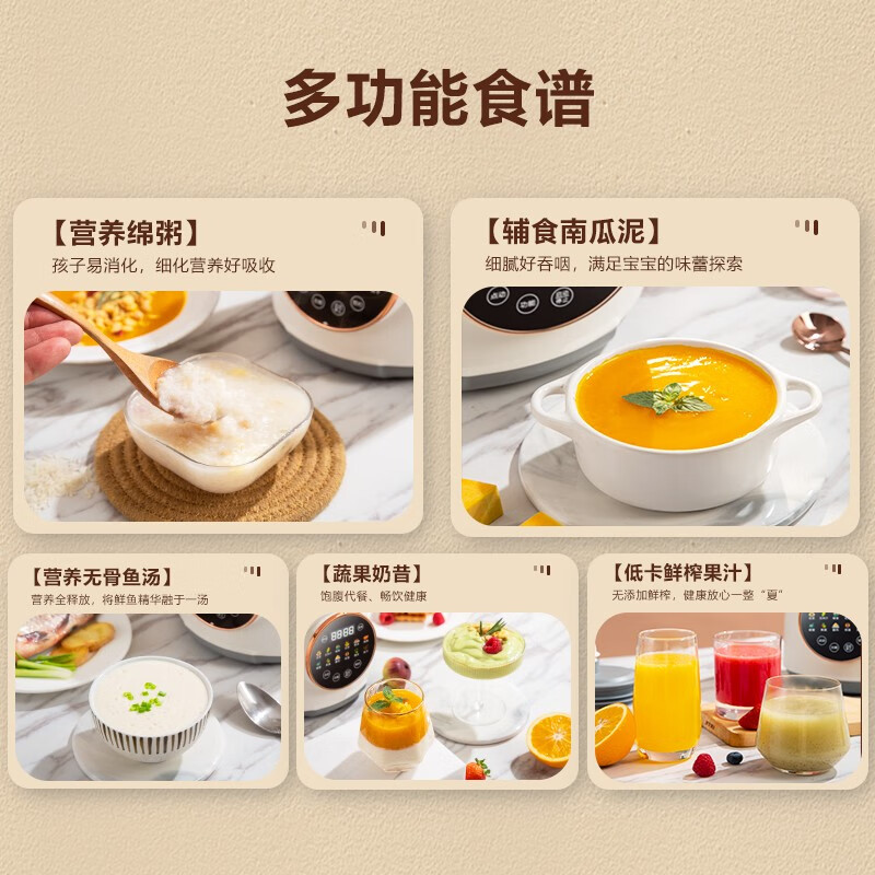 外观外形:很好用声音大小:声音还可以打磨口感:很细腻预约定时:很准时,产品功能:非常全动力大小:很棒除了噪音有点大之外,其余都很好,打出来的豆浆不用过滤,喝起来口感很细腻,值得购买外观外形:特别时尚,颜色好看的适合年轻人声音大小:声音还好,家里一家口足够打磨口感:买过一次,适合打豆浆机器很快收到,小巧玲珑,造型美观,使用方便,晚上预约早晨就可喝到热饮了。