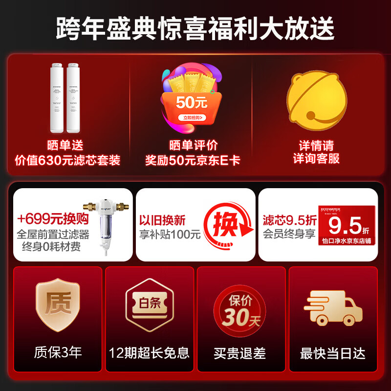 怡口净水器非常理想的一款产品!安装简便、外观漂亮、制作精美。通过过滤的水,清澈透亮,没有异味。快递更是给力!?这个过滤加热一体机非常方便,已使用年,一年换一次滤芯,滤芯物流很快非常不错的净水机,安装方便,净水功能也不错,以前的水壶里有很多水碱,这个净水器出来的水基本上没有什么水碱了,很不错净水器收到,师傅上门安装特别快,还给设置了无线联络,非常满意,特别好