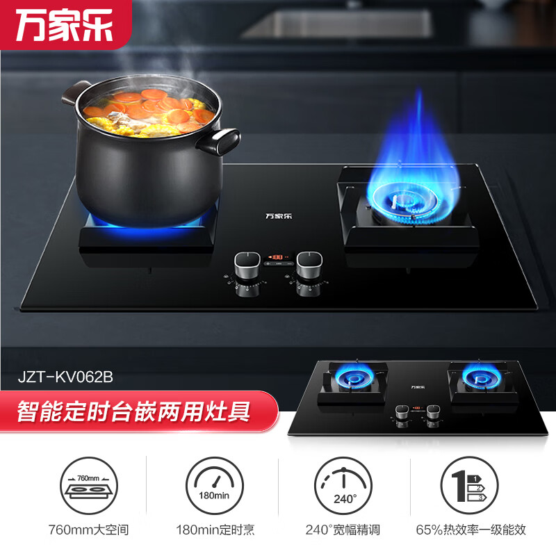 万家乐JZT-KV062B燃气灶天然气灶,选择的原因很简单,这个燃气灶性价比高,而且是不锈钢材质,耐用性好,能效一级,没有那些花里胡哨的东西。安装简单小白也能轻松装好,试了一下火力比较猛,左右性价比很高了,点赞产品很好用,火力够猛,容易打火,外观非常漂亮,颜色高大上,炒完菜也容易清理。非常好用,祝商家生意越来越好。宝贝很快收到了,打开看着挺不错,定时款,很喜欢,大家都说好。客服热情。