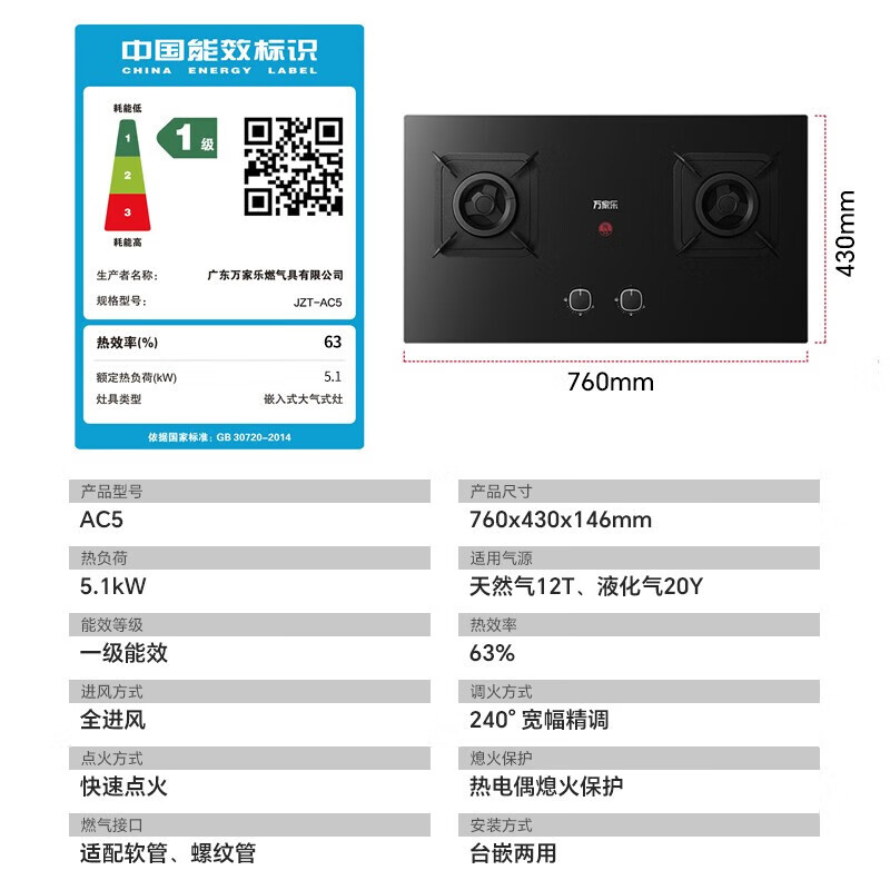 万家乐燃气灶AC5使用后感觉面板很热,感觉没之前使用的那部好。还有就是现场还要再额外购买燃气软管。这个厂家没配发。商品质量很好,跟商家描述的一样,客服也很好,有问必答,物流很给力,值得购买。终于弄好了,火力很大,定时控制也很方便,很满意的,就是地区上门安装真是一波三折,好在都弄好了。客服不错。款式简单大方,价格也很实惠,是买来放公司做饭用的,炒菜的阿姨说火力很猛。不错的。安装后产品非常满意,容易清洁,符合预期,点火也非常快,火很大!期待后期的使用表现!